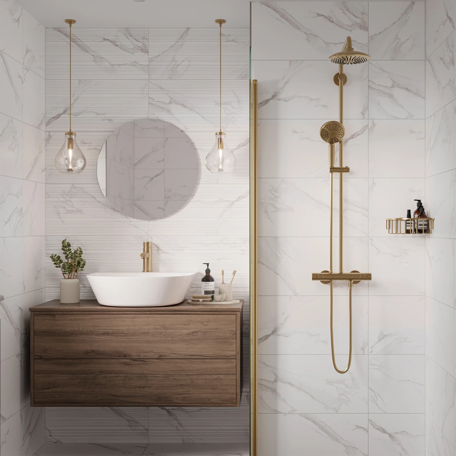 For a little extra eye-candy, why not bring in some grooved texture with the co-ordinating decor tile? This can be used to create a shower feature wall, or a focal point behind a basin, as shown in the main image above.